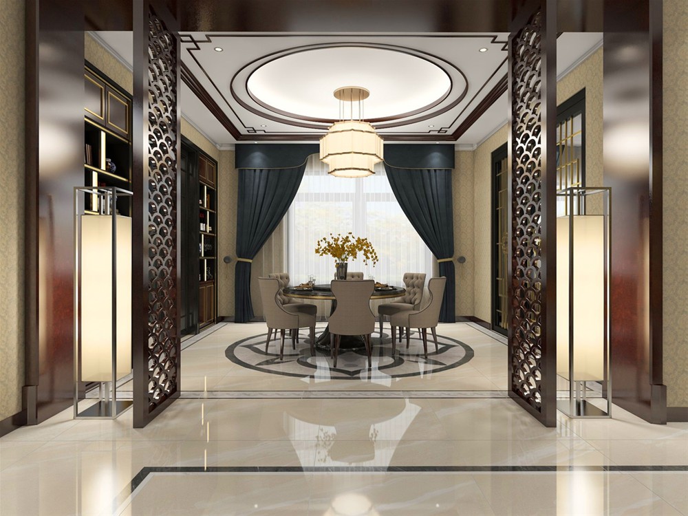 餐廳作為和客廳貫通的空間,利用相協調的深木色酒柜為整墻背景,選擇富有中式格調的地磚拼花,象形荷花圖案,整體空間呈現素雅而明媚,傳統而不失現代,慢慢生出了整個空間的“魂”。讓人覺得在此用餐是為樂事!