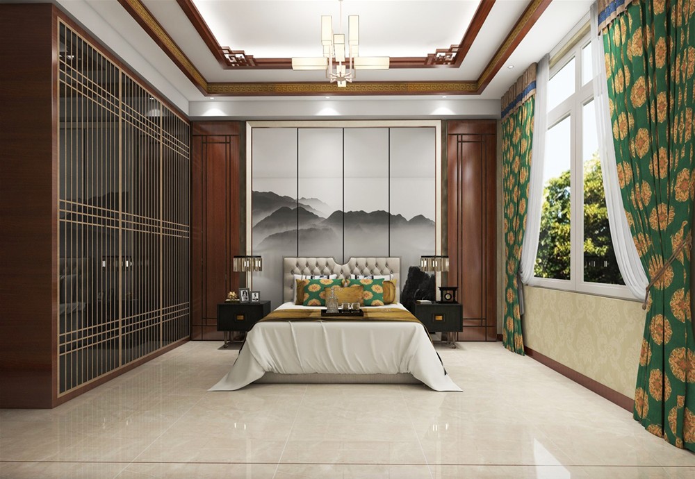 主臥床背景仍利用木色為主構架融會貫通,再加以富有意境的山水壁畫作為更深層的點綴,讓人們在整個空間里感受傳統文化帶來的熏陶與動感,生命也變得溫潤充盈,富有韻味。
