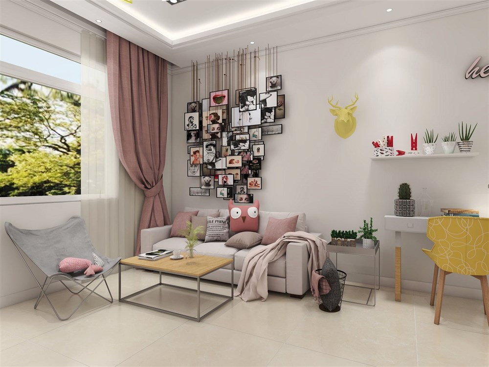 粉色沙發(fā)與粉色窗簾相呼應(yīng)